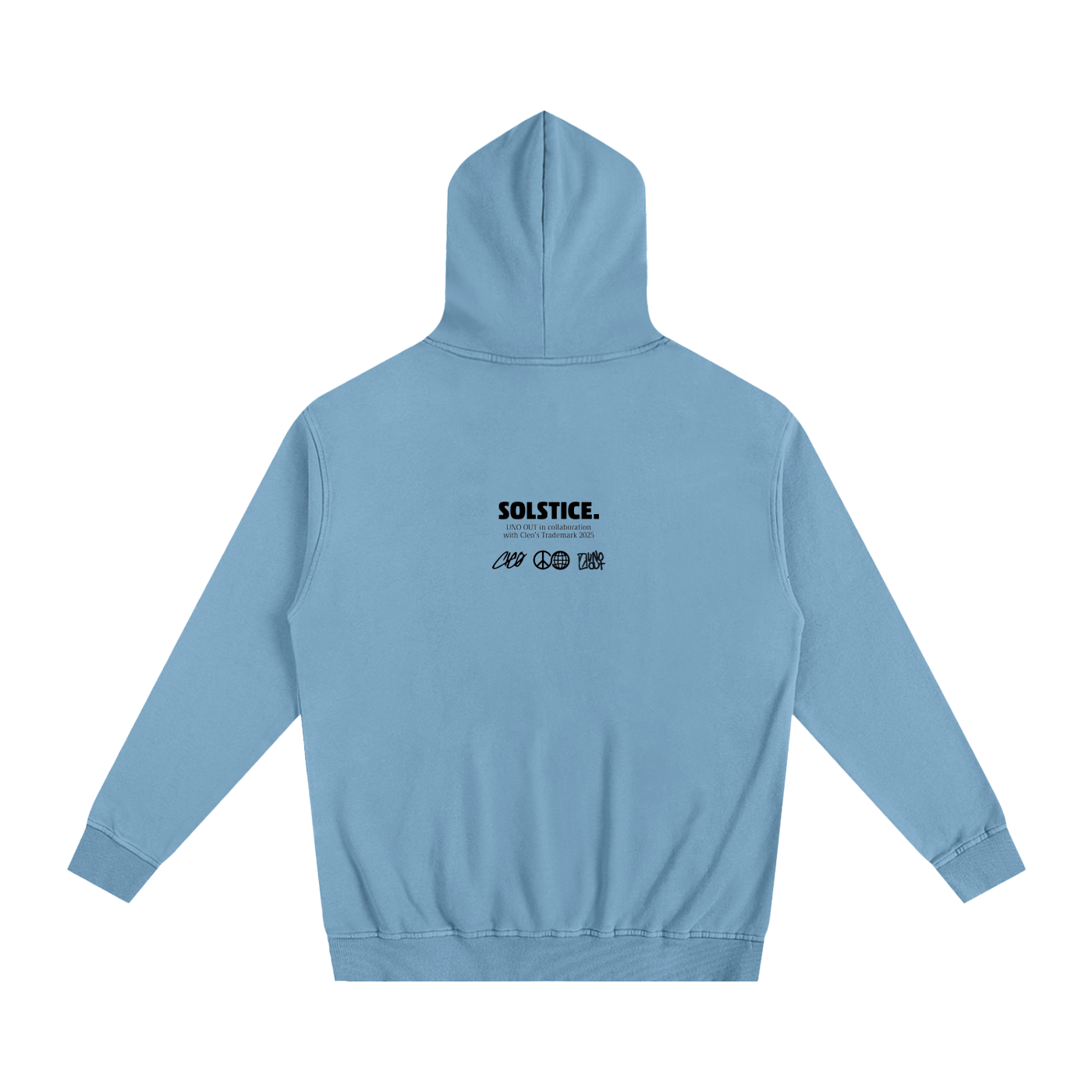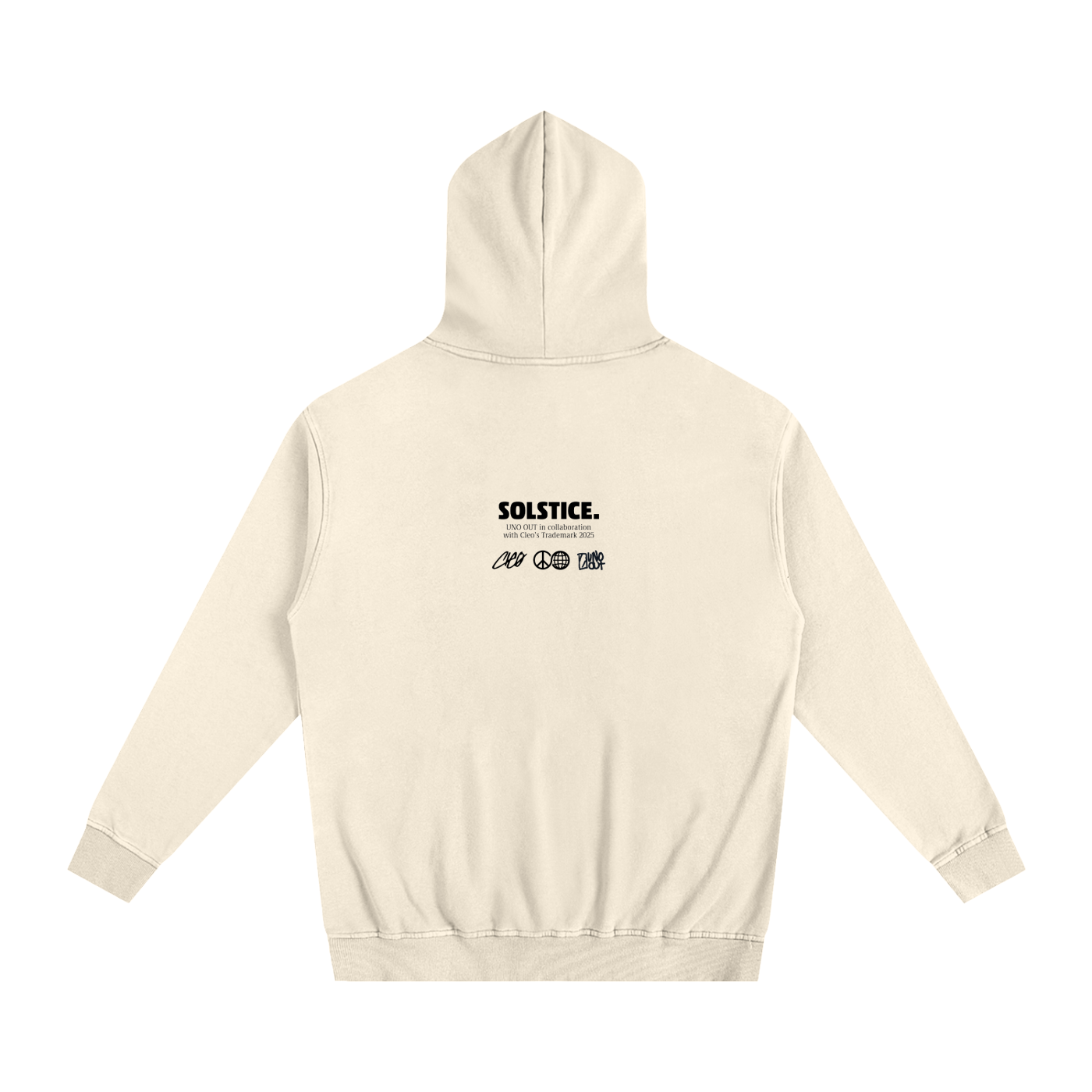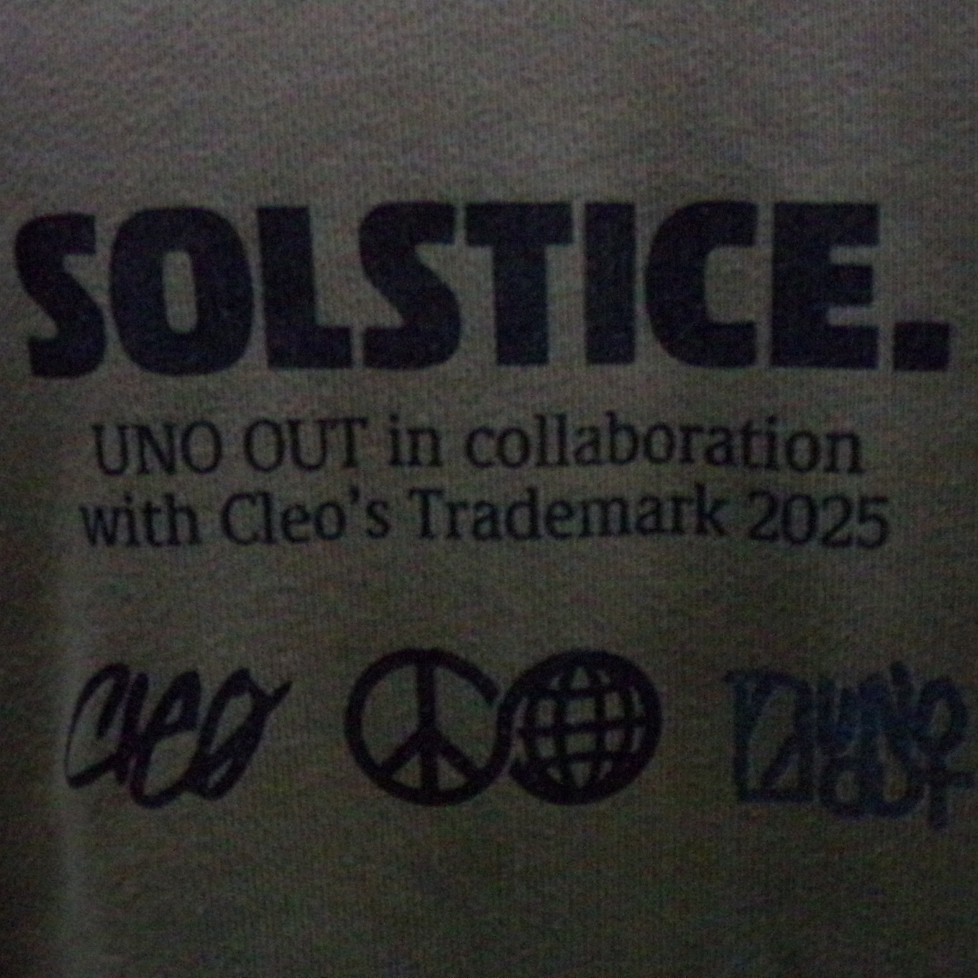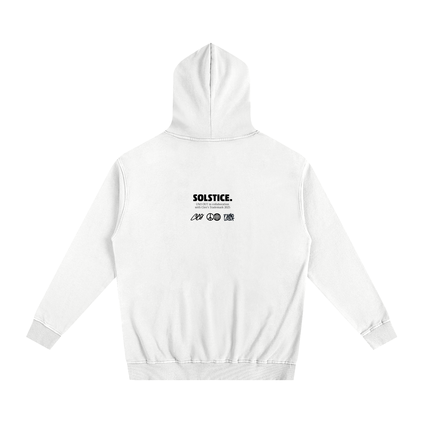 My attempt at a streetwear hoodie. Shoutout UNO for the designs. Supports the "solstice" project. Screen-printed design.